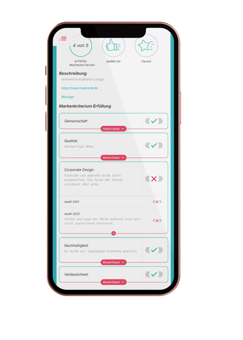 • AI-Supported Analysis: Automated checks review touchpoints for CI/CD compliance, tone of voice, imagery, and brand fit. Deviations are identified at an early stage and supplemented with concrete optimization suggestions.